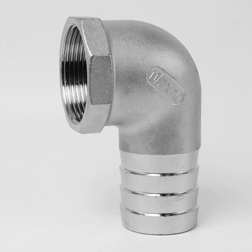Fitting koud gason fil 90 degre:Karakteristik yon fil gason sou yon bout ak yon tiyo kawotchou ki kase sou lòt la, ki fèt pou koneksyon ak konpozan fi-threaded.